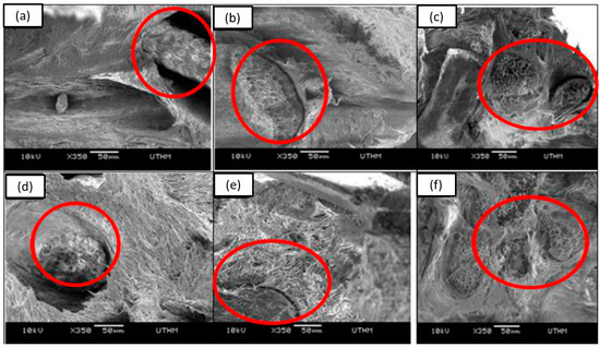 The lack of compatibility of lignocellulosic fibre/matrix can reduce the reactive area to bind the composites [83]. Consequently, this leads to crack propagation in composite laminate due to the occurrence of air voids between the fibre interface and the matrix [84]. Therefore, this phenomenon reduces the impact and tensile properties of the composites [85,86]. In this case, a comprehensive step needs to be taken, including fibre treatment (e.g., chemical modification) to remove impurities and unwanted components. Subsequently, the mechanical performance of SPF-reinforced polymer composites can be improved.