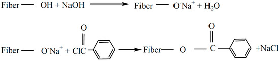 Benzoylation is a useful chemical treatment of SPF as it can enhance the tensile, thermal, and morphological properties of the fibre [149]. In common practice, benzoyl treatment took place when SPF was pre-soaked for 30 min in 18% NaOH solution before being washed and dried. After that, the fibres were suspended in 10% NaOH solution and agitated with 50 mL benzoyl, based on the experiment conducted by Safri et al. [150]. According to Vijay et al. [151], the treatment of the lignocellulosic fibre from Ipomoea pes-caprae significantly improved the fibre surface roughness, providing more activation areas for combination with polymer matrices. This resulted in the enhancement of fibre wettability in the matrix, thus improving the flexural and tensile performance of composites. Figure 3 shows the reaction between the cellulosic –OH group of natural fibre and benzoyl chloride.