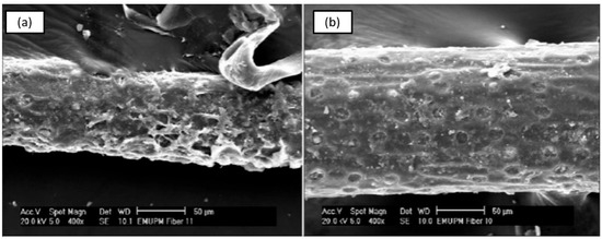 According to Atiqah et al. [146], silane treatment could separate lignin and hemicellulose from the lignocellulosic SPF as the fibres were agitated for 3 h in 2% silane solution. Moreover, the silane treatment on SPF greatly reduced the number of cellulose hydroxyl groups in SPF as compared to the mercerisation of SPF. The research also discovered that this treatment enhanced the degree of crosslinking and increased the active bonding surface area of SPF. This finding is aligned with the work performed by Huda et al. [147]. In another study by Zahari et al. [148], the scanning electron microscopy (SEM) analysis found that narrower gaps were observed at the fracture sites of silane-treated SPF-reinforced polymer composites, as shown in Figure 2. They concluded that silane treatment provides better surface compatibility of SPF.