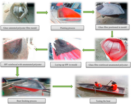 Sugar palm fibre is well-known due to its high durability in seawater. The fibre exhibits good resistance to seawater; hence, the fibre is usually applied as shipping ropes [52,176]. Figure 5 displays the fabrication process of a natural fibre composite boat made from SPF and glass fibre-reinforced unsaturated polyester (UPE) composites [25,72]. The SPF/glass fibre/UPE composite boat was manufactured using compression moulding and the hand-layup technique. The weight of the SPF-composite boat declined by approximately 50% as SPF was used to replace a certain amount of glass fibre. The density of SPF is 1.22–1.26 kg/m3, which is approximately half of the density of E-glass fibre (2.55 kg/m3) that is commonly used in manufacturing fishing boats.
