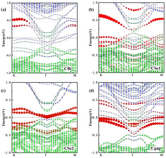 The C substitution for Se created a hole carrier because Bi atoms can accommodate three electrons but there are not enough electrons for the C atom to bond with the surrounding Bi atoms. Thus, in Figure 3b,c, the impurity band near the Fermi level mainly derives from the hole carrier. Moreover, because Se2 atoms are in the center of the QL and strongly localized, there is more than one impurity band between the valence band and the conduction band. In Figure 3a,d, the Fermi level moves up into the conduction band. The Fermi level undergoes an evident shift in energy, presenting somewhat metallic behavior, and the insulation properties are damaged. In Cgap, the impurity bands appear in the gap to accommodate the introduced unpaired electrons. The energy degeneracy is more obvious because the van der Waals force is weaker than the covalent bond. Similar to pure Bi2Se3, the energy band reversed at the Γ point, indicating that the doped system still maintains topological properties. The conduction band is contributed by Bi-p states. The valence band is derived from the Se-p states and the C-2p orbital. The bottom of the conduction band at the Γ point still mainly comes from the p-electron contribution of the Se atom, and the valence band top comes from the p-electron contribution of the Bi atom.