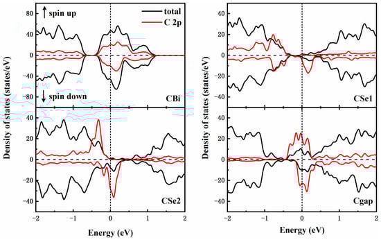 Figure 4 shows the total density of states (DOS) and partial density of states (PDOS) after doping. To make the impurity states more obvious, the intensity of the integral C-2p states was 30 times larger. The narrow highly localized impurity bands exhibiting an obvious spin split around the Fermi level. The spin-up and spin-down densities of states are offset and asymmetrical, indicating the appearance of magnetism. In CSe1 and CSe2, it is obvious that for the spin-up channel there is an energy gap around the Fermi level while the minority spin-down bands cross the Fermi level. The substituted structures are half-metallic ferromagnetic. This is different from the CBi and Cgap, where the majority spin channel is metallic.