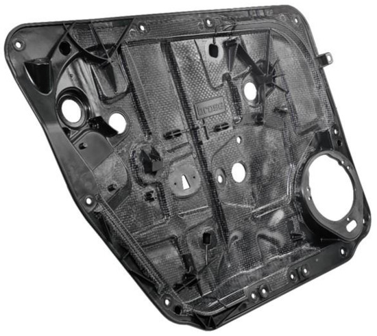 Typical door module carrier hybrid-component made of polypropylene with woven-glass-fiber-reinforced organo sheet and injected with structures (ribs, functional elements, edges, etc.) Reprinted/adapted with permission from Ref. [9]. 2021, ElringKlinger.