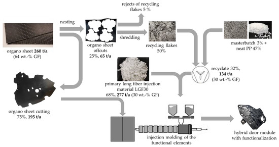This study incorporates the subsequent results as part of a research project that deals with closed-loop recycling, which investigates the recycling of offcuts from thermoplastic fiber composites with continuous reinforcement. The closed-loop recycling of a series-produced hybrid door module was used as an example. Here, organo sheet offcuts were fed directly into production in order to replace primary material for the injection molding of functional elements of the component. The continuous reinforcement of the offcuts promises high potential by achieving the longest fibers possible in manufactured components. This promotes high quality and material recycling where long-fiber glass material can be replaced with consistent mechanical properties. Currently, only short glass-fiber-recycled materials are available on secondary material markets; however, these do not fulfill the mechanical-property profile of the functional elements.