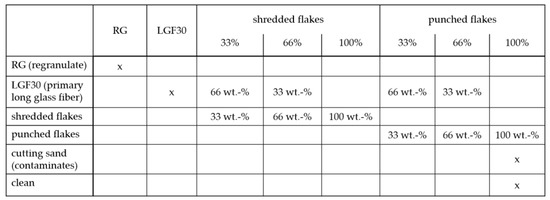 The raw material used in this study is the organo sheet semi-preg (TEPEX Dynalite 104ms-RG601(1)/64mf% black Type S) from Bond-Laminates, consisting of 64 weight percentage of woven glass fibers and 36 wt.-% of the matrix material polypropylene (PP). Furthermore, a primary long-fiber injection material made of 30 wt.-% glass fibers and polypropylene, abbreviated as: LGF30 (GD301FE), which served as a reference for the experimental results, was provided by Borealis. A regranulated material from the company Wipag was used as the second reference material. This regranulated material was produced from organo sheet offcut. The regranulated material is a short glass fiber granulate with a 30 wt.-% glass fiber content based on polypropylene, abbreviated as: RG. By shredding the offcut of the organo sheet, the resulting material has a higher amount of glass fibers; when comparing it with the reference, it must be diluted with neat polypropylene (HJ120UB, Borealis). In addition, a coupling agent has to be used to achieve a better adhesion between the matrix and the fibers (WG068AE from Borealis).