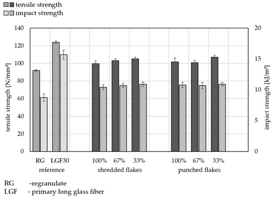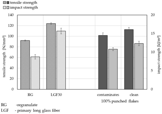 Figure 8 demonstrates the mechanical properties (tensile strength and impact strength) of cleaned and contaminated punched flakes compared to the lower (RG) and upper (LGF30) references. As already described, it can be observed in Figure 5 that the cleaned recycling flakes have better mechanical properties. The series of tests shown in Figure 8 were carried out specifically with punched flakes and demonstrate that cleaning organo sheets of residue increases the benefits of the mechanical properties.
