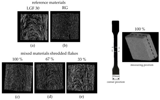 Additional recordings were made using a computer tomograph from Werth Messtechnik. Figure 9 compares the reference materials (RG and LGF30) and the blended variants 100 wt.-%, 67 wt.-% and 33 wt.-% of the shredded flakes. All images were scanned and evaluated with the same settings and resolution to establish a direct comparison. The measurements obtained by computer tomography confirm the results of the mechanical tests. There is no difference between the material mixtures, which means that fiber orientation and fiber lengths are almost identical. Likewise, a significant difference in fiber lengths can be seen in the images of the reference materials (Figure 9a,b) This finding was previously described in Section 3.2, and thus establishes yet another correlation to the mechanical properties (Section 3.1). In image (a) LGF30 below, slightly longer fibers can be seen when compared to images (c) 100%, (d) 67% and (e) 33% of the mixed materials. This also confirms the results of the fiber analysis in Section 3.2 (Figure 5) and the mechanical properties in Section 3.1 (Figure 5).