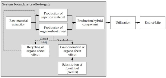 System boundary cradle-to-gate of the production of hybrid component for profitability and life cycle assessment of the considered strategies for organo sheet offcut.