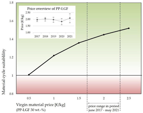 Material cycle suitability for material recycling of organo sheet offcut, which depends on the price of virgin material for PP-LGF (30 wt.-%).
