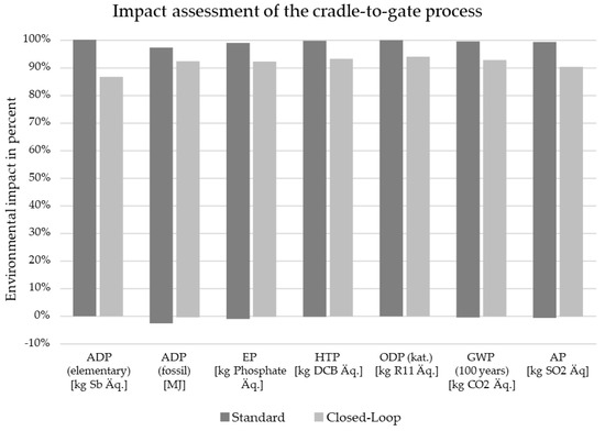 A life cycle assessment (LCA) using the cradle-to-gate system was made according to the international norm DIN EN ISO 14040/14044. The current, standard situation covers processing steps required for raw material extraction, production of semi-finished products, hybrid component production using injection molding and the co-incineration of offcut in a cement plant. Co-incineration replaces fossil fuels, and for this a credit is granted in the LCA on the basis of calorific value. In the closed-loop system, instead of co-incineration, shredding and pretreatment of the offcut material have been (Figure 9) investigated. The functional unit of 1000 units was used for this purpose to quantify input and output flows in the life cycle inventory. For the life cycle impact assessment, the method CML2001 was applied to compare the environmental impact of both systems based on the categories of abiotic resource depletion (ADP) elementary and fossil, the eutrophication potential (EP), human toxicity potential (HTP), ozone depletion potential (ODP), global warming potential (GWP) and the acidification potential (AP). Figure 12 shows the differences between the standard system (co-incineration of the offcut in a cement plant) and the closed-loop recycling process. Compared to the current standard of co-incineration of offcut materials, the closed-loop recycling process achieves a reduction in the environmental impact in all listed categories. In particular, a decrease of 13.3% could be achieved in the abiotic resource depletion (ADP), and the global warming potential (GWP100) decreased by 6,6%. Thus, the reduced environmental effects from the substitution of virgin material exceeded the substitution of fossil energy in the cement production process. Closed-loop recycling is therefore also worthwhile from an environmental point of view.