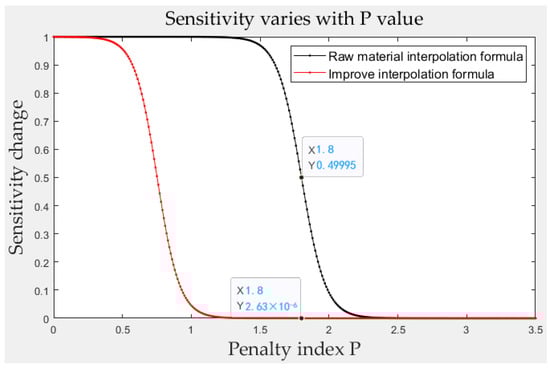 The variation in sensitivity with the penalty index p before the improvement in the material interpolation method formula (black) and after improvement (red).