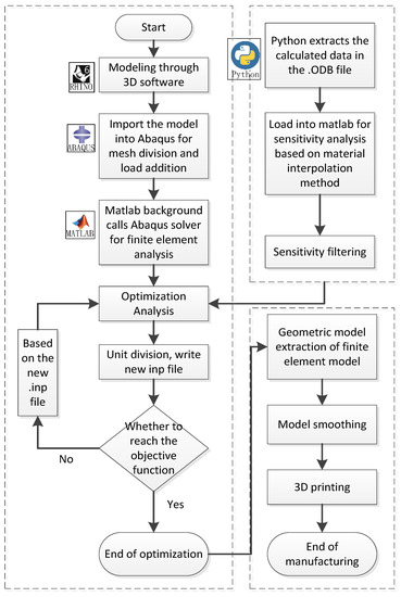 - ABAQUS is called through the MATLAB background to perform the finite element analysis. After the calculation and analysis are completed, the ODB database function of Python is used to extract all the element design variables Xi of the solved design domain.
