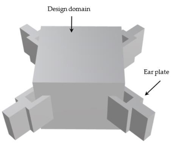 We imported the established model into the finite element software in a 3D model file format, added attributes to it, and divided the mesh. Figure 4 shows the finite element model with meshes. The blue part in the figure is the design domain, and the red part is the connecting part of the ear plate. The grid size of the design domain was 2 mm and the unit was C3D8R, with a total of 64,000 units.