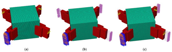 Considering that the bending moment had little influence on the actual project, the pure shear force, the pure axial force, and the combined force of the combination of the two were mainly considered in the optimization. Six degrees of freedom constraints were imposed on the end face of the connecting part to place one end in a fixed state. Figure 5 is a schematic diagram of the working conditions of applying a shear load, axial load, and combined load.