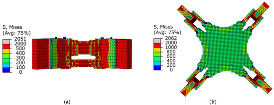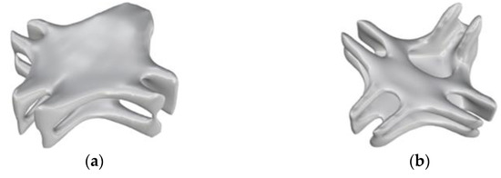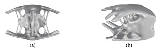Figure 8a,b show graphs of the optimization results under pure axial force conditions. It can be seen that the optimized structure topology was clear, and the unit area between adjacent lugs was curved under the action of axial force, which conformed to its stress condition. There was no checkerboard phenomenon as a whole, and the connectivity was good.
