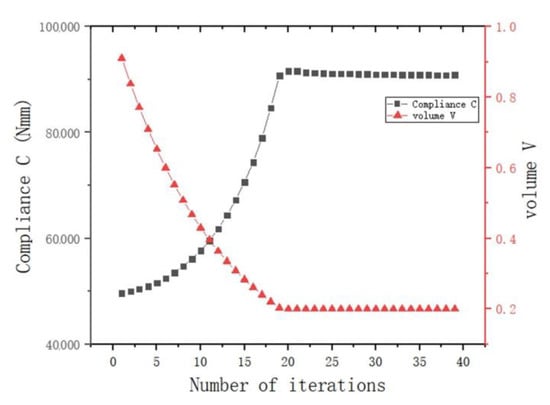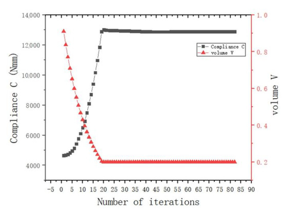 As shown in Figure 8b, there was a uniform higher stress area between adjacent ear plates, while the middle part of the node had a lower stress value, and the overall force was uniform. This meant that the structure as a whole was in a state of high-efficiency stress, which was in line with the actual stress situation. Figure 9 shows the change in total compliance versus the volume fraction for the overall optimization process. With the continuous reduction in the volume fraction, the total compliance increased, indicating that the remaining material was used efficiently. When the volume fraction reached the target value, the total compliance fluctuated continuously, and eventually converged.