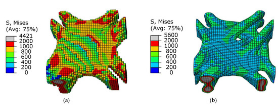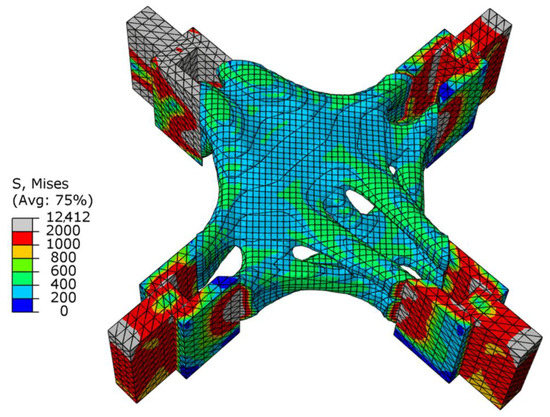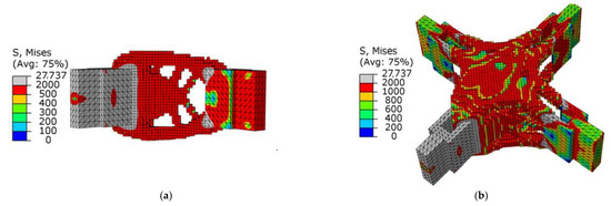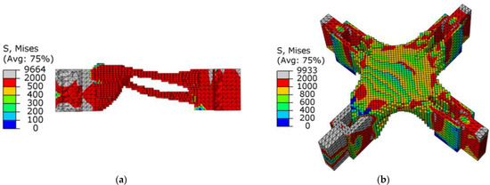 Figure 10a,b show the stress nephograms of the optimization results. Under the action of shear, the node can be approximately regarded as the fusion of three cantilever beams. As shown in Figure 10a, an X-shaped support structure appeared in the middle of the node, which conformed to the topology of the cantilever beam under shear force. The optimization results had no checkerboard phenomenon as a whole.