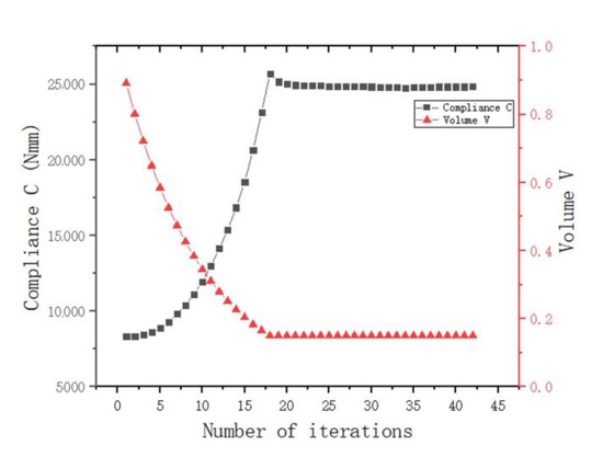Optimization process under the condition of axial force (the black dotted line is the change curve of compliance C, and the red dotted line is the volume-reduction curve).