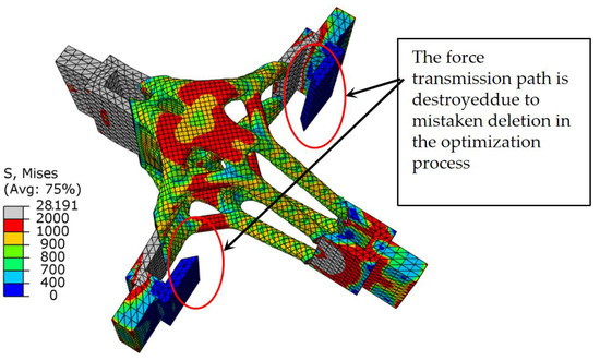 As shown in Figure 14, when the SIMP algorithm was used for optimization, the stress of the overall structure under the shear condition was uniform, the area of maximum stress was concentrated in the middle of the thin rod, and there was a clear difference. As shown in Table 2, the maximum stress of the SIMP algorithm results is 10.12% larger than the BESO algorithm results, and the minimum stress is smaller than the BESO results. It should be noted that when using SIMP to optimize, the volume in the first step was reduced to 20%. The stress distribution of the BESO optimization results was more uniform, indicating that the whole structure was in a highly efficient load state, which effectively reduced the damage caused by the stress concentration in the structure. The circle in Figure 15 is the unit that was deleted by mistake in the first step, and the unit was not supplemented even in subsequent iterations. In the calculation of BESO, compared with SIMP’s volume-shrinkage method, its method of gradually reducing the volume ensured that the weak force-transmitting members of the structure could be retained.