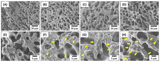Representative FE-SEM images of dual-scale porosity structures produced using different PMMA contents: 0 vol% (A,E), 20 vol% (B,F), 30 vol% (C,G), and 40 vol% (D,H). The yellow arrows indicate the pores created by the removal of PMMA microspheres via heat treatment.