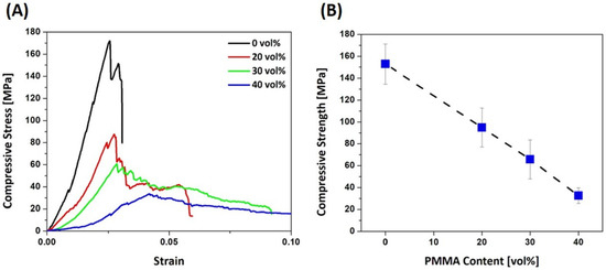 The mechanical properties of dual-scale porosity alumina structures produced using different PMMA contents (0 vol%, 20 vol%, 30 vol%, and 40 vol%) were measured by compressive strength tests. Figure 5A shows the representative compressive stress versus the strain responses of samples. Without PMMA addition, the sample showed a rapid increase in stress with an increase in strain. After reaching the maximum value, it rapidly decreased, indicating the brittle fracture of the alumina walls [47,48]. The sample produced using the lowest PMMA content (20 vol%) showed a similar stress–strain curve. However, even after the maximum value, a retention of noticeable stress was observed. This tendency became more obvious with an increase in PMMA contents to 30 vol% and 40 vol%. This was attributed to the local fractures of the porous alumina walls. More specifically, some of the porous alumina walls were first fractured instead of an entire fracture occurring. Thus, the remaining alumina walls could to a certain extent withstand additional loads. Compressive strengths, computed from the peak loads observed, decreased from 152.9 ± 18.3 MPa to 32.6 ± 7.2 MPa with an increase in PMMA content from 0 vol% to 40 vol%, as shown in Figure 5B. These values are comparable to, or even higher than, those obtained for the porous alumina produced using camphene-based freeze casting [45,49]. This finding suggests the utility of dual-scale porosity structures compared to uniform porous structures.