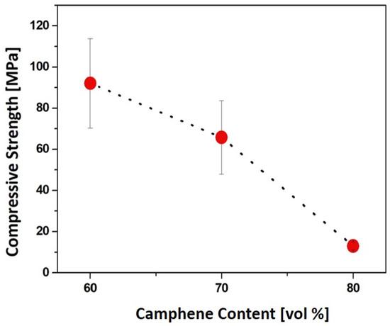 Compressive strengths, computed from the peak loads observed, decreased from 92.1 ± 21.7 MPa to 13.0 ± 1.9 MPa with an increase in camphene content from 60 vol% to 80 vol%, as shown in Figure 9.