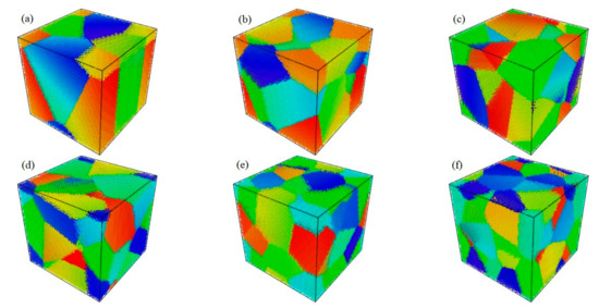 Polycrystals can be simulated using ‘Atomsk’ with the Voronoi tessellation rule [40]. In the process of polycrystalline establishment, box side length and seed number are chosen. In this study, a box with dimensions 200 Å × 200 Å × 200 Å was set, and the number of seeds varied from 2 to 30. Due to the constant volume of the box, the higher the number of seeds, the smaller the average size of the polycrystals. In this study, the average grain size was calculated by dividing the box size by the number of seeds. Then the average grain diameter was calculated, assuming a spherical volume to describe the grain. The grain size range in this study was, therefore 8–20 nm. Figure 2 shows polycrystals randomly generated when the numbers of seeds are 3, 6, 9, 12, 21, and 30, respectively. The corresponding average grain sizes in Figure 2a–f displayed using the Open Visualization Tool (OVITO) [41] are approximately 17, 14, 12, 11, 9, and 8 nm, respectively.