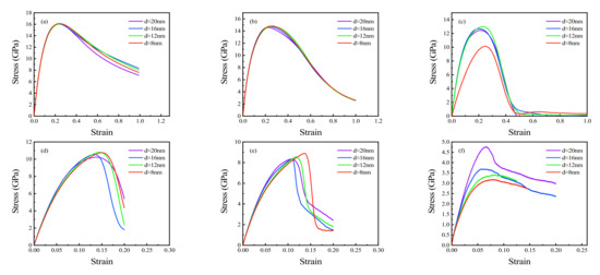 Polycrystalline Cu6Sn5 (average grain size = 8–20 nm) were stretched to study their stress–strain response at different strain rates (Figure 4a–f). The tensile strain rates selected in this study were 0.0001, 0.001, 0.01, 0.1, 1, and 10 ps−1, respectively. The variations in stress–strain curves with grain size were almost identical; thus, only the stress-strain curves with grain sizes of 8, 12, 16, and 20 nm were selected for further analysis. In the case of higher strain rates (10, 1, 0.1 ps−1; Figure 4a–c), the differences of stress-strain curves with different grain sizes were small. As the strain rate decreased (0.01, 0.001, and 0.0001 ps−1; Figure 4d–f), the differences in the stress–strain curves under different grain sizes became more obvious. These differences are discernible via the slope at the linear stage (Young’s modulus) and via yield stress and the UTS when stretching. The influences of grain size on Young’s modulus, yield stress, and UTS are analyzed in detail in the following sections.