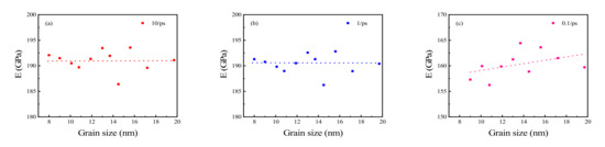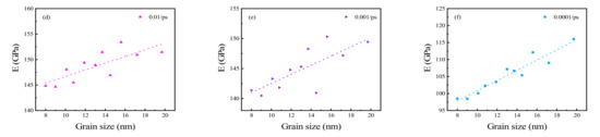 According to the iso-strain criterion, the Young’s modulus of a polycrystal can be expressed as Equation (3) [42], where Ec represents the Young’s modulus of the polycrystal, and represent the Young’s modulus of grain and grain boundary, respectively, and and represent the volume fraction of grain and grain boundary, respectively. With an increase in grain size, the volume proportion of the grain boundaries in the whole polycrystal is larger. The grain boundaries comprise disordered atoms with weaker interactions between these atoms compared to the grain, so the Young’s modulus of the grain boundaries is lower than the Young’s modulus of the grain itself. Therefore, with the increase in grain size, the proportion of the grain boundaries in the polycrystal becomes smaller, and thus, the total Young’s modulus of the polycrystal increases.
