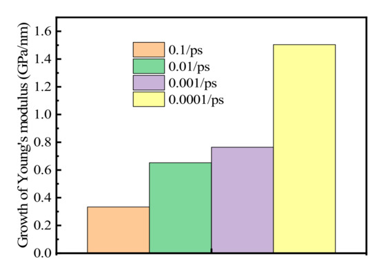 The growth rate of Young’s modulus with grain size at strain rates of 0.0001–0.1 ps−1 is shown in Figure 6. The average Young’s modulus increased when the average grain size increased by 1 nm (Figure 5a–f: 0.33255, 0.65244, 0.76375, 1.50395 GPa at strain rates of 0.1, 0.01, 0.001, and 0.0001 ps−1, respectively). Therefore, Young’s modulus increases faster with increasing grain size at lower strain rates than that at higher strain rates. It was therefore concluded that the effect of grain size on Young’s modulus is greater at lower strain rates, which in turn means that it is more easily affected by grain size at a lower strain rate.