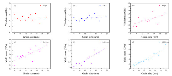 Since there is no obvious yield point during stretching, it is difficult to determine the maximum stress at which permanent deformation begins to occur. Thus, the 0.2% offset yield stress was used in this study. The results are shown in Figure 7. When the strain rate is 10 ps−1, the yield stress fluctuates randomly with changes in grain size. When the strain rate decreases from 1 to 0.0001 ps−1, the yield stress increases proportionally with an increase in grain size. As the strain rate decreases, the stability of this trend improves. The trends of yield stress with changing grain size at different strain rates closely mirror those of Young’s modulus.