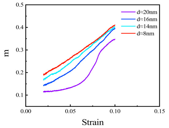 The above results demonstrate that the mechanical properties of polycrystalline Cu6Sn5 are affected by strain rate during tensile processes. Thus, strain rate sensitivity, m, is used to measure sensitivity, as shown in Equation (4) [45], where and represent flows stress and strain rate, respectively. Since the effects of grain size are more obvious at lower strain rates, the strain rates used in this calculation were 0.001 and 0.0001 ps−1, respectively. The strain range corresponding to flow stress is 0.02–0.08 (Figure 4e,f). Polycrystals with four grain sizes (20, 16, 14, and 8 nm) were selected for analysis. The results are shown in Figure 9. The results showed that the strain sensitivity of small grain size polycrystals is greater than that of larger grain size polycrystals. The strain rate sensitivity decreases with increasing grain size. At the same time, the strain rate sensitivity increases with increasing strain with the four-grain size polycrystals.