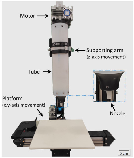 The samples were printed using a Potterbot Micro 10 (3D Potter, Stuart, FL, USA) illustrated in Figure 2, with a nozzle of 6.0 mm in diameter, a layer height of 3.5 mm, and a printing speed of 15 mm/s. This 3D printer is composed of a ram-type extruder where low extrusion rates can promote a slightly bleeding or segregation as a consequence of the high pressure applied [40]. However, more accurate and stiff layers can be printed with this type of extruder when compared to screw-type extruders [41]. The “printability” corresponds to the ability to produce a continuous filament without disruption, while the “buildability” corresponds to the ability to resist successive layer deposition without collapsing. The printability was assessed by printing a continuous filament of 200 mm in length, similar to that proposed by Ma et al. [30]. The buildability was assessed by determining the maximum number of layers printed prior to the overall specimen collapse or the printing of an off-axis (i.e., eccentric) layer when continuously printing a cylindrical specimen of 75 mm in diameter. It is commonly accepted that fresh 3DP elements can fail either by buckling or by the plastic collapse of material [42], leading to a general instability. However, failure can also occur on the scale of a single layer [43], and excessive deformation can cause inadequate layer deposition. This will prevent further layer deposition even though the specimen could support the weight of subsequent layers without abruptly collapsing.