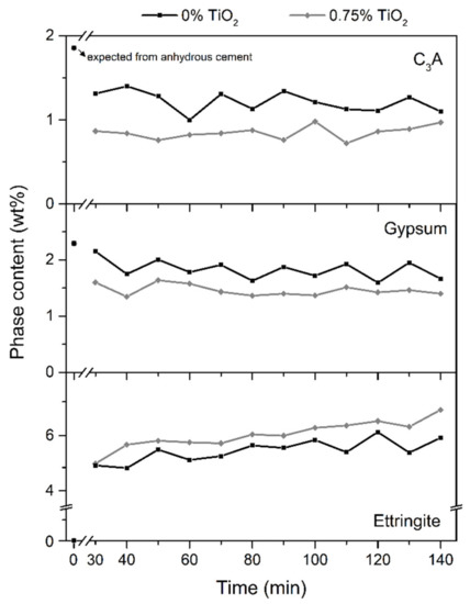Figure 3 shows the C3A, gypsum, and ettringite contents over time obtained by in situ XRD and Rietveld QPA for the pastes without nanomaterial (0 wt.% TiO2) and with the intermediate content used in this work (0.75 wt.% TiO2). The remaining samples were not measured due to equipment access restrictions. The other major phases from the anhydrous cement (C3S, C2S, and C4AF) marginally reacted within the first 140 min of hydration in line with [46,51], so they are not shown. The incorporation of nano-TiO2 increased the C3A and gypsum consumption and the ettringite precipitation within the first 140 min of hydration. For example, the ettringite content of the 0.75% TiO2 mix was about 1 wt% higher than that of the system with 0% TiO2 at 140 min of hydration. This trend can be attributed to the very high SSA of the nanoparticles (70.2 m2/g), which provide extra surface for the nucleation and growth of hydrated products—here, more specifically ettringite [52]. Hargis et al. [53] demonstrated through in situ soft X-ray images that ettringite can also preferentially grow in nucleation sites such as those commonly observed for C-S-H [52]. Although cement was partially removed to incorporate the nano-TiO2, the removal levels were low (0.25–1.50 wt.% in general; 0.75 wt.% for in situ XRD), so factors such as the dilution effect (i.e., the higher water availability due to the increase in the effective water/cement ratio [54]) and the reduced clinker content can be neglected. In turn, it is known that the cement hydration rate is directly related to the surface area of the particles [55]. For instance, the incorporation of 0.75 wt.% nano-TiO2 increased the SSA of the binder fraction (i.e., cement + silica fume + nano-TiO2) by 12% compared to the reference mix (i.e., from 4.27 to 4.78 m2/g), explaining the further reaction degree of the mix containing the nanomaterial at the first 140 min of hydration. In line with our results, Bhojaraju et al. [56] and Wang et al. [57] also reported increased ettringite precipitation within the first hours of hydration in the presence of nanoparticles of graphene oxide and C-S-H, respectively.