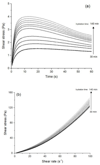 Figure 4 exemplifies the curves obtained in the time-resolved rheological tests for the 0% TiO2 mix: the shear stress vs. time in Figure 4a and the flow curves in Figure 4b. Figure 5 shows the rheological properties of the pastes with 0, 0.75, and 1.50 wt.% TiO2 over time, and Table 3 shows their structuration rate parameters (Athix). After 130 min, the static yield stress of the 1.50% TiO2 mix grew exponentially, so it was not considered in the linear fit to determine Athix. It is worth mentioning that the shear stress values found were significantly lower than those reported for 3DP mortars [58,59] due to the absence of aggregates in the samples.