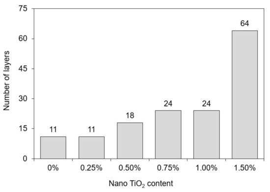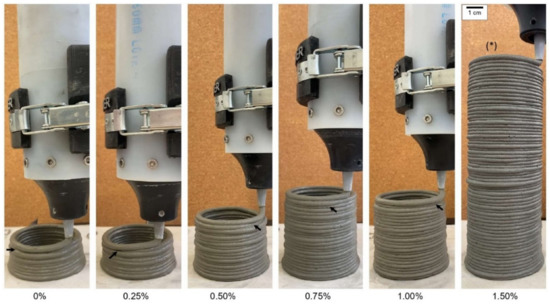 Figure 6 shows the samples during the buildability tests, and Figure 7 shows the buildability results in terms of the maximum number of printed layers before failure. The failure criterion is explained in Section 2.3.1. The incorporation of nano-TiO2 progressively improved the buildability of the mixes, increasing the maximum number of printed layers from 11 (0% TiO2) to 64 (1.50% TiO2). This can be explained by the increase in the yield stress at the first measurement (30 min) promoted by nano-TiO2 incorporation, identified by the rheological test results (see Section 3.2). It is well known that freshly printed material must have yield stress that resists the gravity-induced stress from the above layers [41]. By increasing the yield stress of the mixes through nano-TiO2 incorporation, the number of printable layers also increased. This relation was confirmed by Yang et al. [23], which simultaneously observed increases in the yield stress and reductions in the vertical displacement of freshly printed mortars (also at 30 min) with nano-CaCO3 incorporation, improving their resistance against collapse. For instance, 1% and 2% nano-CaCO3 incorporation in limestone replacement reduced the vertical displacement of printed elements by 11.1% and 44.4%, respectively, compared with that containing only limestone. Finally, the yield stress of pastes at 30 min increased by up to 116% with the nano-TiO2 incorporation, while the buildability of mortars increased by 4.8 times. Although these two properties are related, the rheological tests were conducted in paste samples, while the 3DP tests were conducted in mortar samples. Therefore, we could not establish a direct correlation between these two parameters.