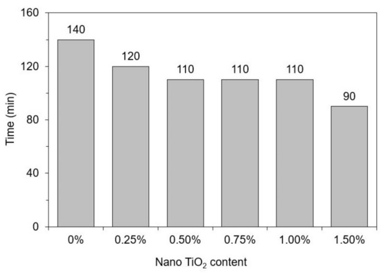 TiO2 nanoparticles are often used in cement-based materials for photocatalytic purposes, as mentioned above [10,11,12]. In turn, the fresh-state performance of cementitious materials containing nano-TiO2 is much less addressed than materials containing other nanoparticles. Senff et al. [25,26] evaluated the influence of nano-TiO2 addition on the rheological behavior of cement paste and mortar. The yield stress and viscosity of pastes increased by 148% and 24%, respectively, when 1 wt.% nano-TiO2 was incorporated. Besides, nano-TiO2 increased the thixotropy of paste, visually assessed by the hysteresis loop but not quantified. Furthermore, mortar spread (related to yield stress) was reduced by up to 7.4% when 5.2 wt.% nano-TiO2 was incorporated. Joshaghani et al. [27] investigated the effect of TiO2, Al2O3, and Fe2O3 nanoparticles incorporation (0–5 wt.%) on the fresh properties of self-compacting concrete. The authors reported that the TiO2-containing concretes required 1.5 times more superplasticizer than plain concrete to reach the required slump flow. Besides, nano-TiO2 led to the highest admixture demand despite having the lowest specific surface area among the nanoparticles. Similarly, Jalal et al. [28] assessed the effect of TiO2 nanoparticles incorporation (0–5 wt.%) on the fresh performance of self-compacting concrete, observing that the increase in the nano-TiO2 content progressively reduced the slump flow (associated with yield stress) by up to 9% and increased the V-funnel time (associated with viscosity) by up to 24% compared to plain concrete.