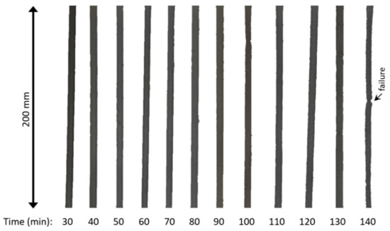 Figure 8 shows the printability test results in terms of “open time”, defined as the period during which the sample was printable, i.e., it was possible to print a continuous filament with 200 mm in length without any failure, defect, or disruption. Figure 9 exemplifies the filaments obtained in the printability test for the reference mix; all the filaments are shown in Supplementary Materials Figure S1. The incorporation of nano-TiO2 progressively reduced the open time of the cementitious composites from 140 min (0% TiO2) to 90 min (1.50% TiO2). This can be attributed to the higher flocculation and hydration rate in the presence of nano-TiO2 (discussed in Section 3.1 and Section 3.2), which increases the rigidification rate of the material and reduces the period that it is “castable” (in this case, printable). Unfortunately, since we could not conduct the rheological test in mortar samples, we were not able to define yield stress and viscosity values that allow suitable 3DP.