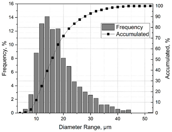 Gas-atomized CuSn10 powder was used for manufacturing the SLM products. SEM investigations were used to determine the particle size and morphology, which showed the powder’s spherical shape and good morphology in the as-received powder. A total of 1068 particles were measured for the size distribution study. The average particle size of 17.3 ± 7.3 μm was determined. The total grain size distribution is shown in Figure 2. In addition, the flowability was investigated using flow analysis, where a flow time of 7.1 ± 0.3 s was measured.