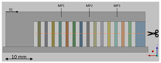 For the calibration of the simulation, a process simulation of the deformation bridge was set up and built without correction (correction factor = 1). A linear approach with a Cartesian method and an element size of 0.1 mm was used for meshing. The distortion that occurred in the simulation over the coordinate X1 was matched with the experimental tests (see Figure 4). A correction factor was introduced to compensate for inaccuracies due to the simplifications and deviations in the material model that affected the magnitude of the resulting deformation. For the iterations of the correction factor, a deviation of 1% at the end of the measuring section X1 was selected as a termination criterion. Once this limit was reached, the simulation was considered calibrated and used to calculate the residual stresses at three measuring points: MP1, MP2, and MP3.