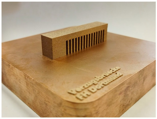 A material model was developed using the investigated mechanical properties. Some main parameters are given in Table 2. The parameters were partly measured and partly taken from the literature. The aim was to map the temperature dependency of the parameters over the entire range occurring in the buildup process. This was partly achieved through data from the German Copper Institute and a research paper by G. Branner on the modeling of transient effects in the structural simulation of layer construction processes with copper alloys. The two sources were used because they provide temperature-dependent data [26,27]. The relationship between stress and strain is represented by the bilinear isotropic strain hardening material model. This was considered sufficient as it could represent the expected deformations. The process simulation was developed in Ansys Workbench 2020 R2 as a sequentially coupled thermal–mechanical simulation using the Additive Wizard [28].