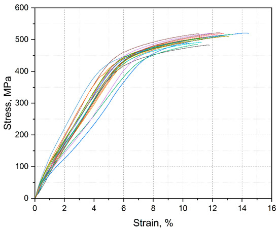 The stress–strain diagrams are shown in Figure 7. Almost no necking was observed, which resulted in no drop after the ultimate tensile stress was reached.