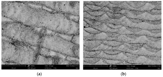 SEM images of a sample after the SLM process are presented in Figure 8. The transverse and longitudinal sections are shown in Figure 8a,b, respectively. The individual melt traces can be seen, which were only slightly deep in the longitudinal section.