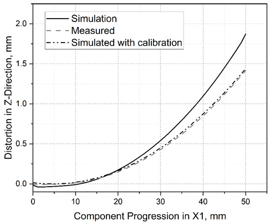 Figure 9 indicates the deformation in the buildup direction along the measuring section X1. The dashed graph presents the average deformation of the measured specimens after removing the support material. The solid line shows the simulated deformation without correction (correction factor = 1). As in [22], the deformation was significantly higher than in the laboratory tests. This was assumed to be related to an insufficiently accurate material model and the introduced simplifications, especially since many thermal sizes could not be given over the whole temperature range because no data were available. However, the deformation behavior was in good agreement with the laboratory tests. A correction factor of 0.1367 was iteratively determined, where the deviation of the simulation from the laboratory experiment was less than 0.5%. The deformation simulated after calibration is shown as a dot stroke line and almost coincided with the laboratory experimental results. All other data refer to the calibrated simulation.