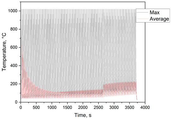 The simulated temperature curve during the manufacturing process is shown in Figure 10 in which the maximum and average temperatures are plotted for the individual steps. The peak points of the maximum curve indicated the individual exposures since the melting temperature was present at these times. The times in between corresponded to the cooling between the individual exposures. The course of the average temperature decreased at the beginning, which was due to the growing component volume. The increase in the later course, where even the maximum temperature no longer rose to the manufacturing temperature, was due to the manufacturing of the cantilever arm of the component. This had a significantly larger area to expose, which meant that more heat was supplied to the component, and the component generally heated up. After completing the buildup process, both temperature curves dropped to the ambient temperature, i.e., the manufacturing process was complete.