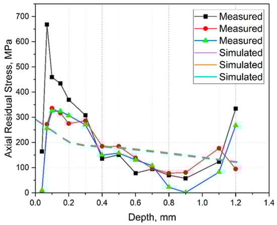 The simulated and measured axial residual stresses were compared to validate the simulations, as shown in Figure 12. The solid and dashed lines represent the measured and simulated results, respectively. As can be seen, the simulated ones were in the same order of magnitude as the measured ones. However, quite large deviations could be seen on the surface due to the hole-drilling nature that could not measure a very fine gradation on the surface.