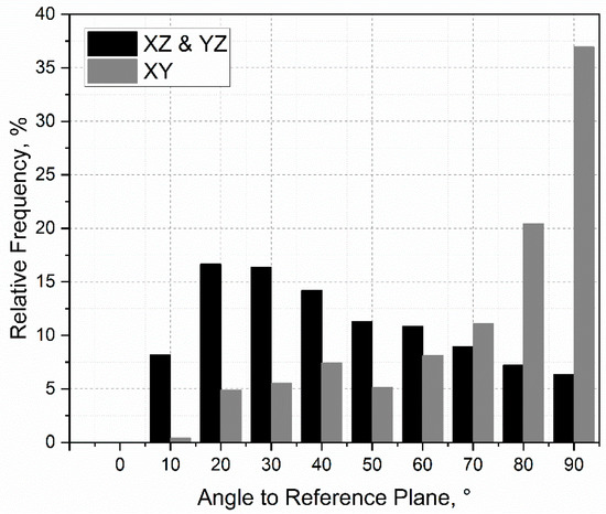 The simulated microstructural analyses are shown in the following. For this purpose, a representative volume element (RVE) was simulated with an edge length of 0.5 mm, as shown in Figure 13a,b. In Figure 13a, fine grains, which are typical for the SLM process with a significant expansion in the buildup direction (Z-axis), can be seen. An average circle-equivalent diameter of 19 ± 11 μm was measured. Grain orientations, which depend on their angle to their reference plane, are presented in Figure 13b. While the longitudinal planes (XZ and YZ) had predominantly flat angles, the angles at the transverse plane (XY) tended to be right-angled. In Figure 14, the frequency of grain orientation with respect to the plane is presented, showing that the grains in the XZ and YZ planes tended to have shallow angles relative to their respective planes. Accordingly, the grains departed from a random orientation and favored a preferred direction in the Z-direction. The orientation of the grains in the XY plane showed an even more pronounced preference for the Z-direction. This indicated that the grains had a preferred direction in the assembly direction (Z-axis), which demonstrated the typical anisotropy of the SLM process.