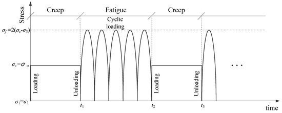 Figure 1 shows the creep–fatigue interaction process of the CGS under triaxial compression (σ1 > σ3, σ1 and σ3 are axial and confining stresses), where the interaction order can be the creep first followed by fatigue (creep–fatigue interaction, C-F for short), or the fatigue first followed by creep (fatigue–creep interaction, F–C in short). For each creep–fatigue interaction process, the creep stress (σ1 = σc, σc is the creep stress, σc − σ3 is the deviatoric stress of creep) is applied to the CGS for a period of time (t = t1) and unloaded to be σ1 = σ3, and then the fatigue stress in terms of semi-sine (σ1 = σf = 2σc|sinωt|, ω is circular frequency, ω = 2πf, f is fatigue loading frequency) is applied to the CGS for a period of time (t = t2 − t1). Let the creep deviatoric stress (σc − σ3) be equal to the average deviatoric stress of the fatigue cycle (σa = σc − σ3, σa is the average deviatoric stress of fatigue, σa = (σf − σ3)/2) since in order to establish a relationship under the same stress factor.