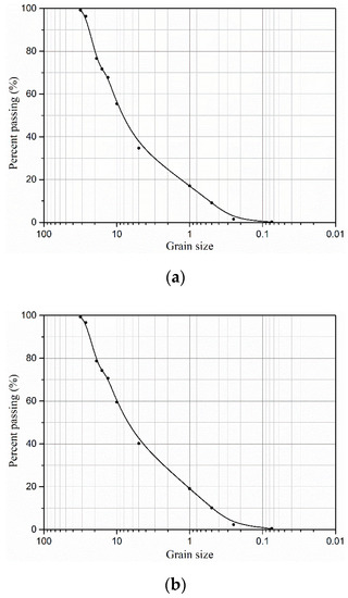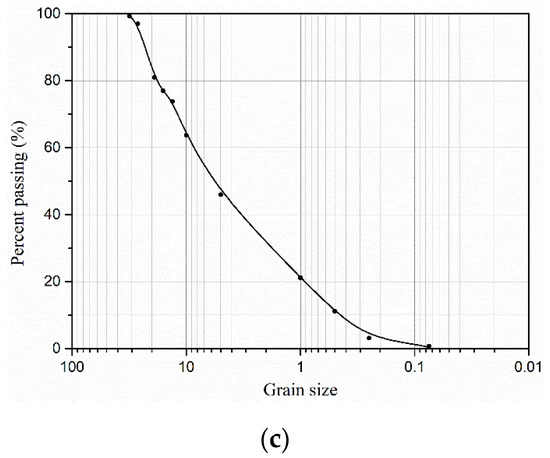 Grain–size distributions curves for three different gradations of CGS: (a) S1; (b) S2; and (c) S3.