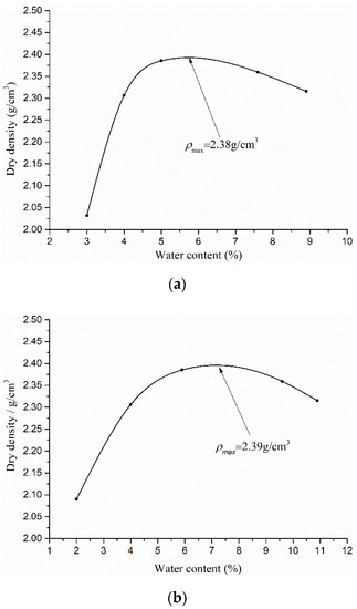 According to the Code for the Design on Subgrade of Railway in China (TB10001-2005), three different gradations of CGS were prepared by different mass ratios of pebble (γ) (with high elastic modulus), sand and clay (with rheological properties), as listed in Table 1. Figure 2 and Figure 3 showed their grain–size distribution curves and water content (w)–dry density (ρd) curves for three different gradations of CGS, respectively. The CGS specimens are cylinders of Φ300 mm × 600 mm and prepared by the layered compacting method (Figure 4).